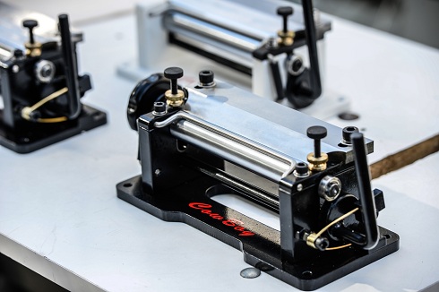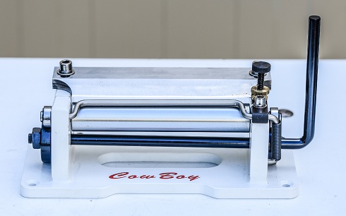 Máquina manual para rebajar cinturones y tiras para trabajos artesanos de cinturones, guarnicioneria y todo tipo de artesania del cuero, ancho util 15 centimetros, regulación de altura del rodillo para espesor del rebajado, apertura del rodillo para facilitar la introducción de la tira.