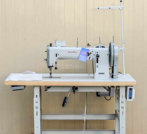 Одноигольная швейная машина челночного стежка с рукавной платформой, с тройным (унисонным) продвижением материала для тяжелых и сверхтяжелых материалов, для шитья сверх толстыми нитками и ШНУРОМ. С увеличенным качающимся челноком "баррель".